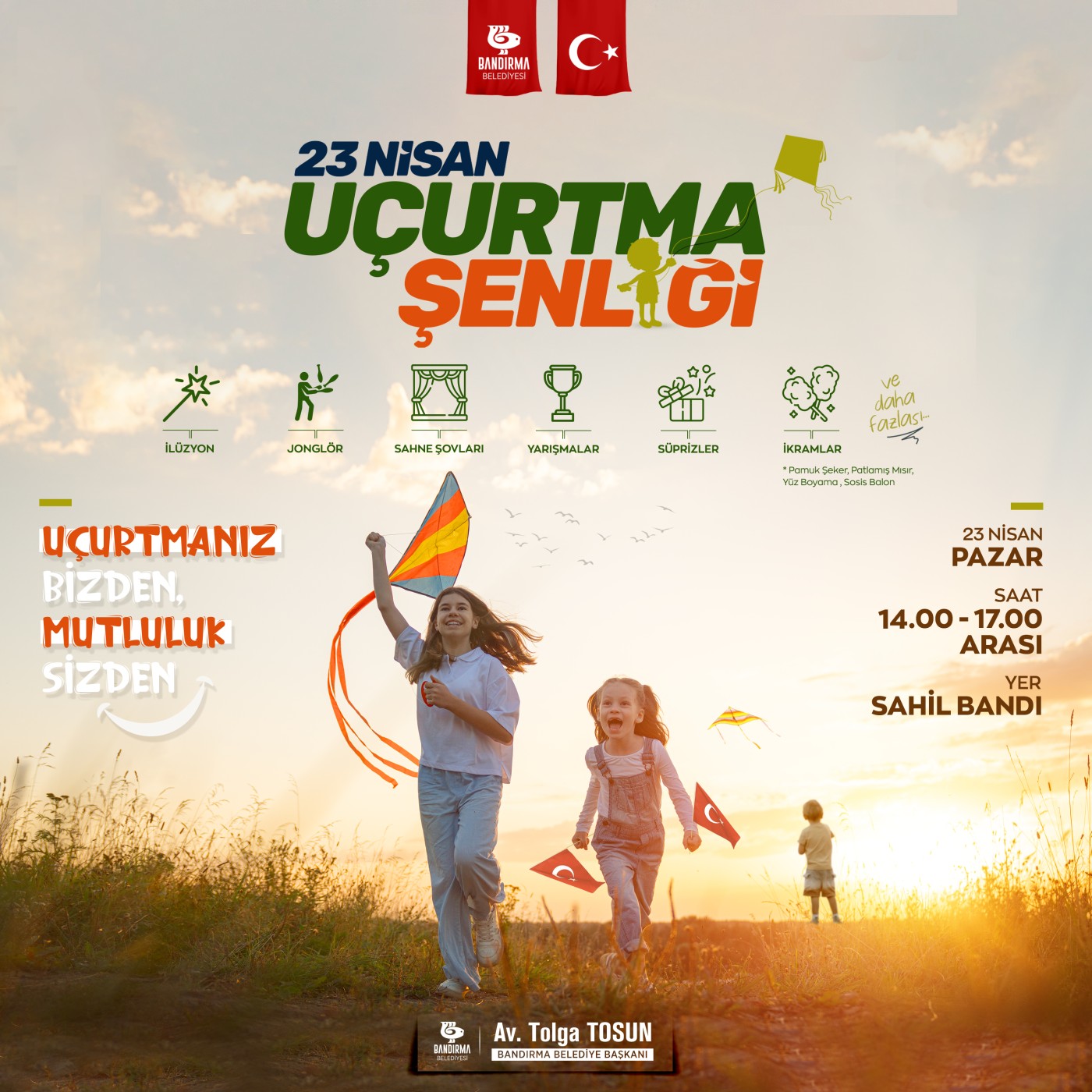 Sevgili çocuklar, uçurtmanız bizden mutluluk sizden…😊23 Nisan Ulusal Egemenlik ve Çocuk Bayramı’nda uçurtmalar gökyüzü ile buluşuyor. Sonsuz maviliğin rengarenk uçurtmalarla kaplanacağı, çeşitli yarışmaların ve sürprizlerin sizlerle buluşacağı Uçurtma Şenliğimize tüm çocuklarımızı bekliyoruz.