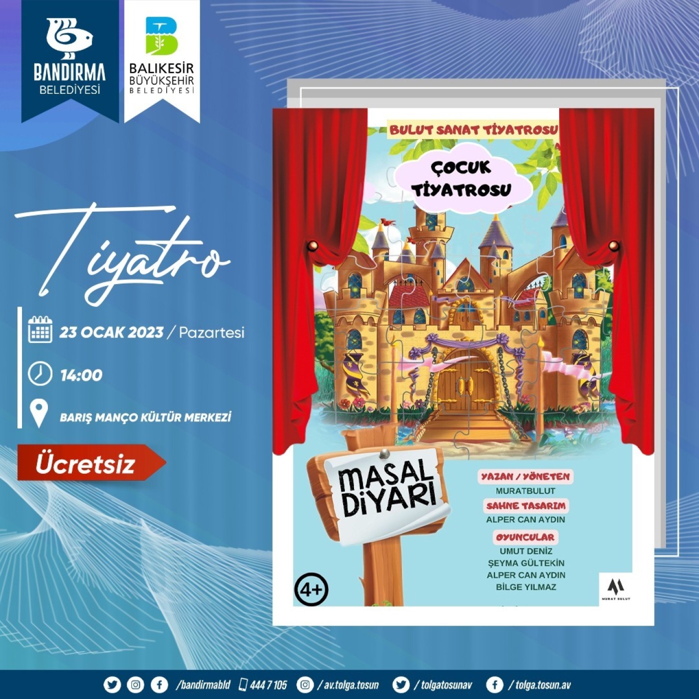 Bandırma Belediyesi ve Balıkesir Büyükşehir Belediyesi iş birliği ile organize edilen Masal Diyarı çocuk tiyatrosu biletlerini bugünden itibaren Barış Manço Kültür Merkezi'nden ücretsiz olarak temin edebilirsiniz.