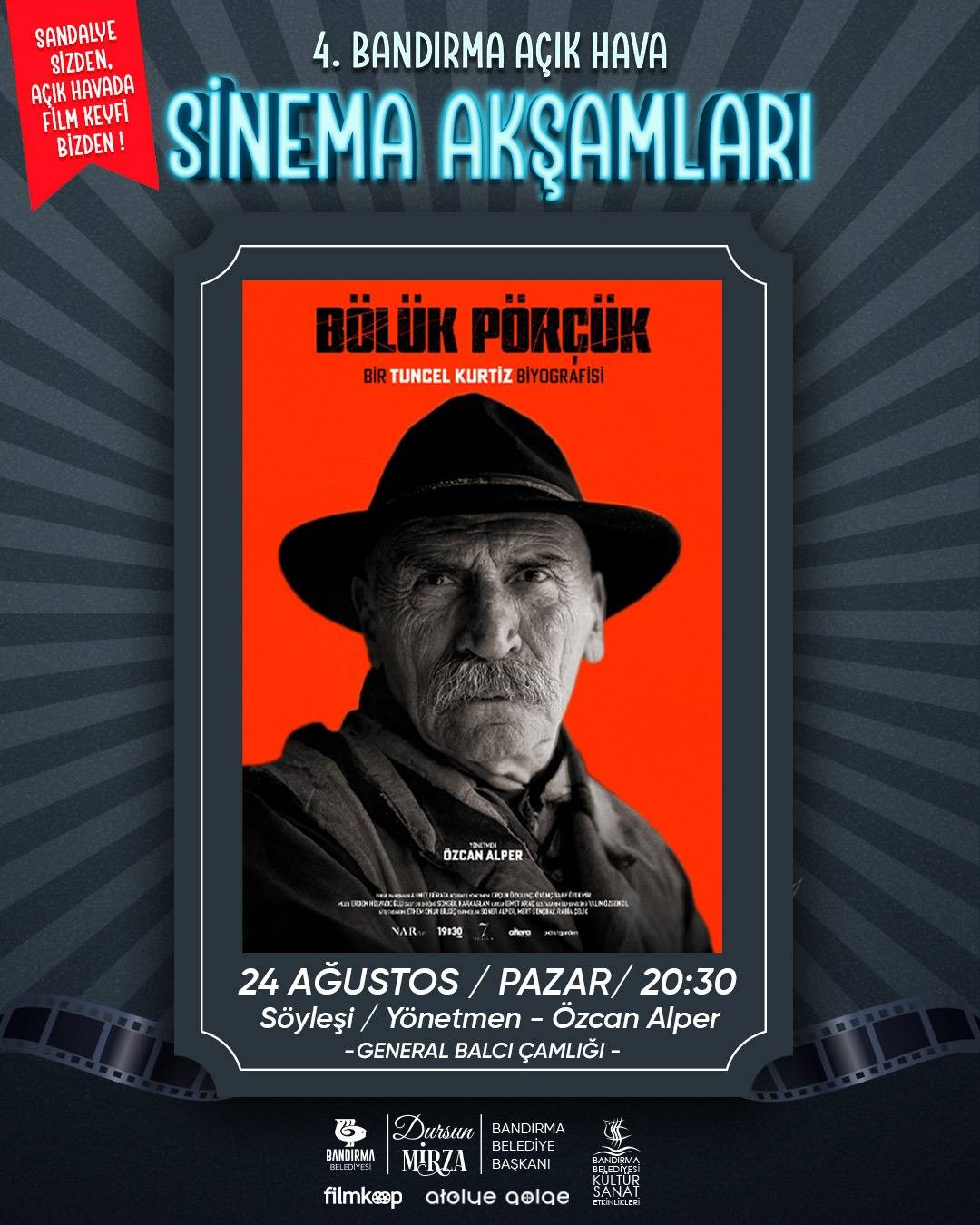 “Yıldızların Altında, Şehrin Ortasında Sinema Keyfi” 💫 Bandırma Belediyesi öncülüğünde, Film Koop ve Atölye Gölge katkılarıyla hazırlanan 4. Bandırma Açık Hava Sinema Günleri, 24 Ağustos’ta, General Balcı Çamlığı’nda başlıyor. Her yıl büyük bir ilgiyle takip edilen Bandırma Açık Hava Sinema Günleri, bu yıl da sinemaseverleri yıldızların altında buluşturacak. Birbirinden seçkin filmler, açık havanın eşsiz atmosferi altında birleşerek bizlere keyifli bir yaz akşamı sunacak. 📅24 Ağustos Pazar / 20.30 📽️Bölük Pörçük / 🎙️Yönetmen Özcan Alper 📅25 Ağustos Pazartesi / 20.30 📽️Bildiğin Gibi Değil / 🎙️Yönetmen Vuslat Saraçoğlu 📅26 Ağustos Salı / 20.30 📽️Hemme’nin Öldüğü Günlerden Biri / 🎙️Yönetmen Murat Fıratoğlu 📅27 Ağustos Çarşamba / 20.30 📽️Büyük Kuşatma 📅28 Ağustos Perşembe / 20.30 📽️Ölü Mevsim 📌Tüm hemşehrilerimizi, sandalye veya taburelerini alarak bu özel etkinliğe katılmaya davet ediyoruz.