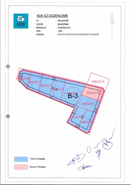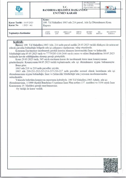 Belediye Encümeninin 10.05.2023 tarih ve 462 sayılı Encümen kararı ile 100. Yıl Mahallesi 1063 ada 210-211-212-213-214-215-216-217-218-219 parsellere ait ada içi düzenlemesinin, 1/1000 ölçekli Bandırma Uygulama İmar Planı notlarının 137. Maddesi ve 3194 sayılı İmar Kanununun 19. maddesi gereği onaylanmasına,