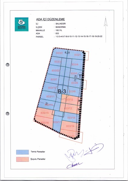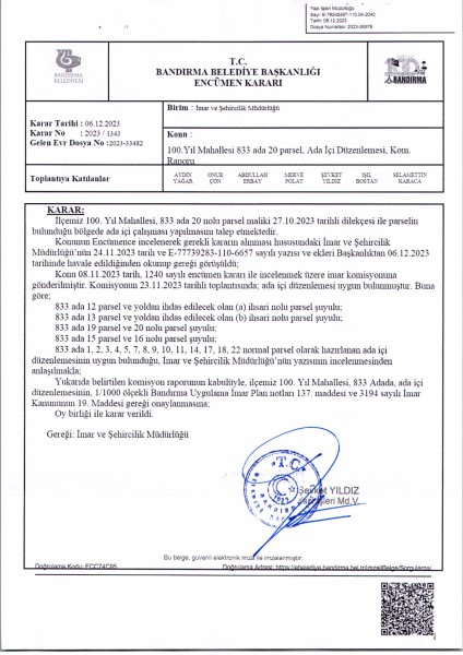 Belediye Encümeninin 06.12.2023 tarih ve 1343 sayılı Encümen kararı ile 100. Yıl Mahallesi, 833 ada 1-2-3-4-5-7-8-9-10-11-12-13-14-15-16-17-18-19-20-22 nolu parsellere ait ada içi düzenlemesinin, 1/1000 ölçekli Bandırma Uygulama İmar Planı notlarının 137. Maddesi ve 3194 sayılı İmar Kanununun 19. maddesi gereği onaylanmasına,