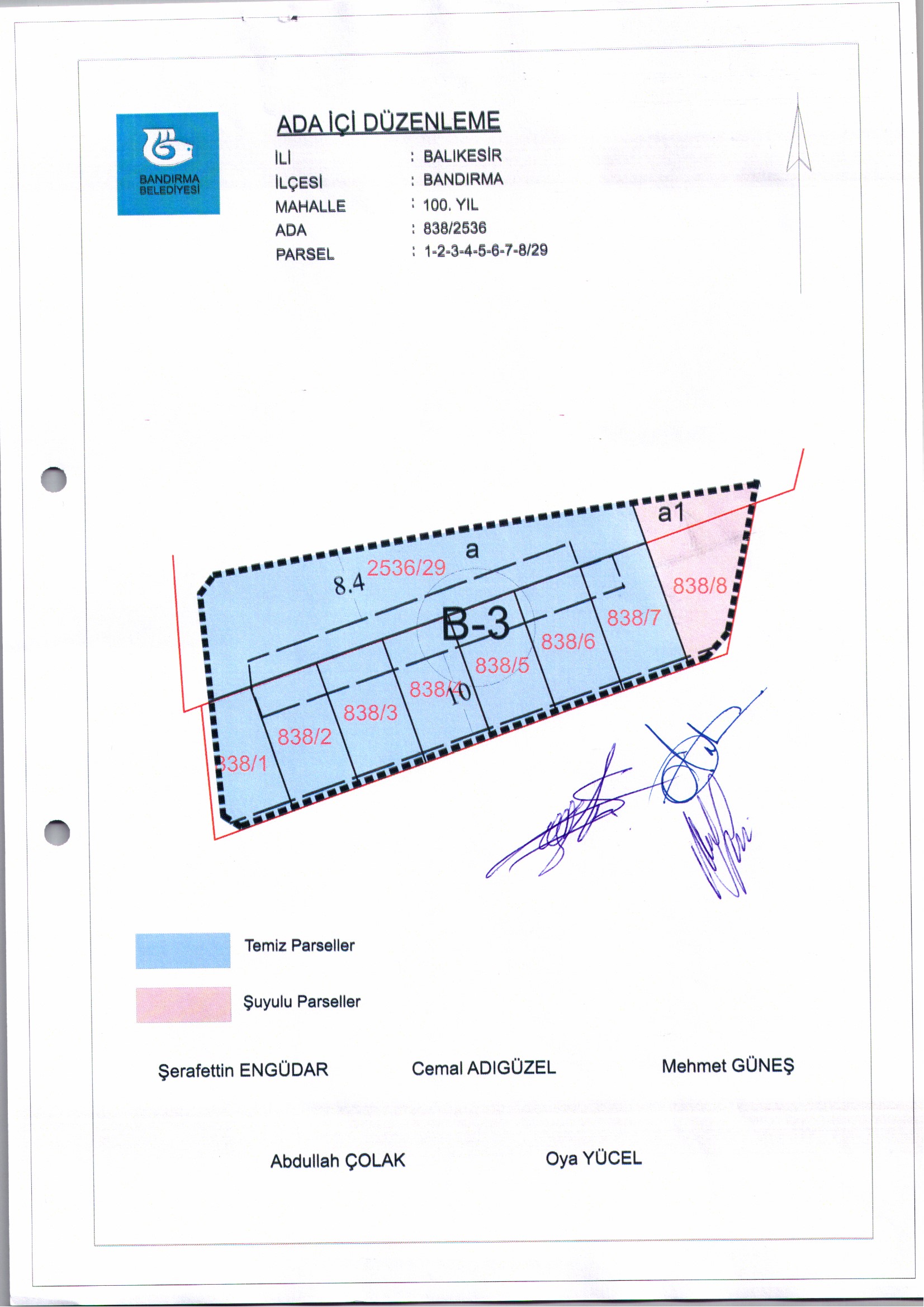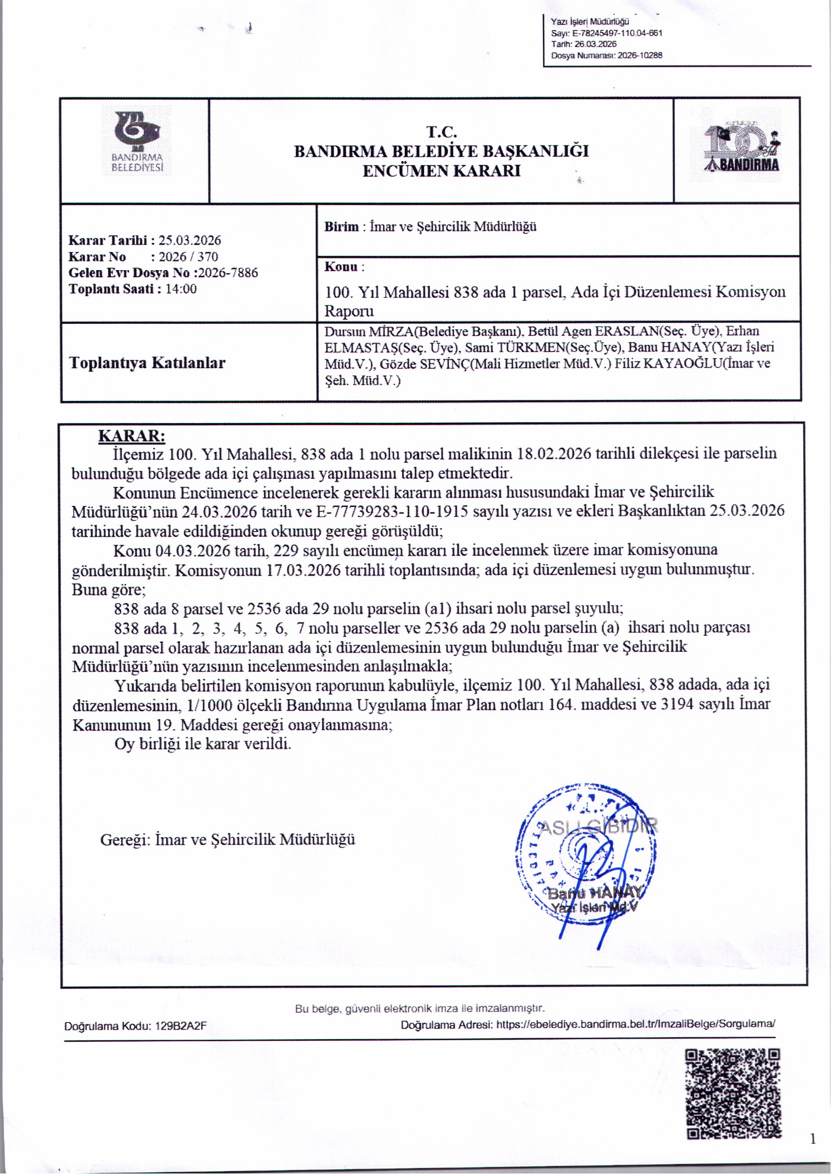 Belediye Encümeninin 25.03.2026 tarih ve 370 sayılı Encümen kararı ile, 100. Yıl Mahallesi, 838 ada, 1-2-3-4-5-6-7-8 parseler ve 2536 ada 29 nolu parsele ait ada içi düzenlemesinin, 1/1000 ölçekli Bandırma Uygulama İmar Planı notlarının 164. Maddesi ve 3194 sayılı İmar Kanununun 19. maddesi gereği onaylanmasına,