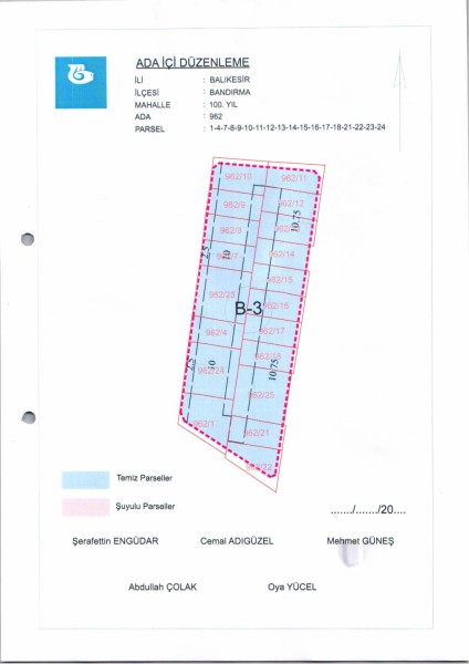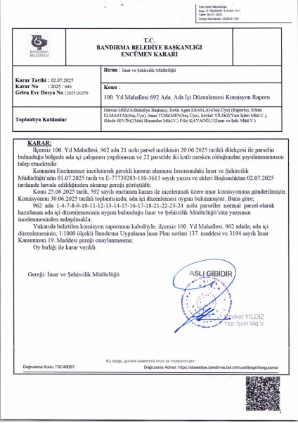 Belediye Encümeninin 02.07.2025 tarih ve 640 sayılı Encümen kararı ile, 100. Yıl Mahallesi, 962 ada 1-4-7-8-9-10-11-12-13-14-15-16-17-18-21-22-23-24-25 nolu parsellere ait ada içi düzenlemesinin, 1/1000 ölçekli Bandırma Uygulama İmar Planı notlarının 137. Maddesi ve 3194 sayılı İmar Kanununun 19. maddesi gereği onaylanmasına,