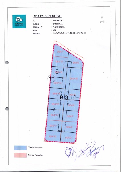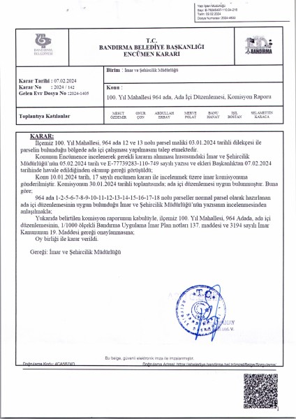 Belediye Encümeninin 07.02.2024 tarih ve 142 sayılı Encümen kararı ile 100. Yıl Mahallesi, 964 ada 1, 2, 5, 6, 7, 8, 9, 10, 11, 12, 13, 14, 15, 16, 17 nolu parsellere ait ada içi düzenlemesinin, 1/1000 ölçekli Bandırma Uygulama İmar Planı notlarının 137. Maddesi ve 3194 sayılı İmar Kanununun 19. maddesi gereği onaylanmasına,