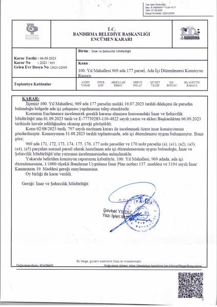 Belediye Encümeninin 06.09.2023 tarih ve 915 sayılı Encümen kararı ile 100. Yıl Mahallesi 969 ada 170-171-172-173-174-175-176-177 parsellere ait ada içi düzenlemesinin, 1/1000 ölçekli Bandırma Uygulama İmar Planı notlarının 137. Maddesi ve 3194 sayılı İmar Kanununun 19. maddesi gereği onaylanmasına,