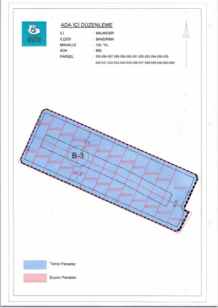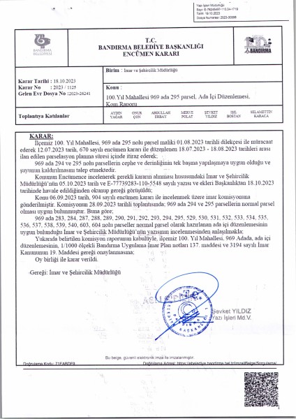 Belediye Encümeninin 18.10.2023 tarih ve 1125 sayılı Encümen kararı ile 100. Yıl Mahallesi, 969 ada 283-284-287-288-289-290-291-292-293-294-295-529-530-531-532-533-534-535-536-537-538-539-540-603-604 parsellere ait ada içi düzenlemesinin, 1/1000 ölçekli Bandırma Uygulama İmar Planı notlarının 137. Maddesi ve 3194 sayılı İmar Kanununun 19. maddesi gereği onaylanmasına,
