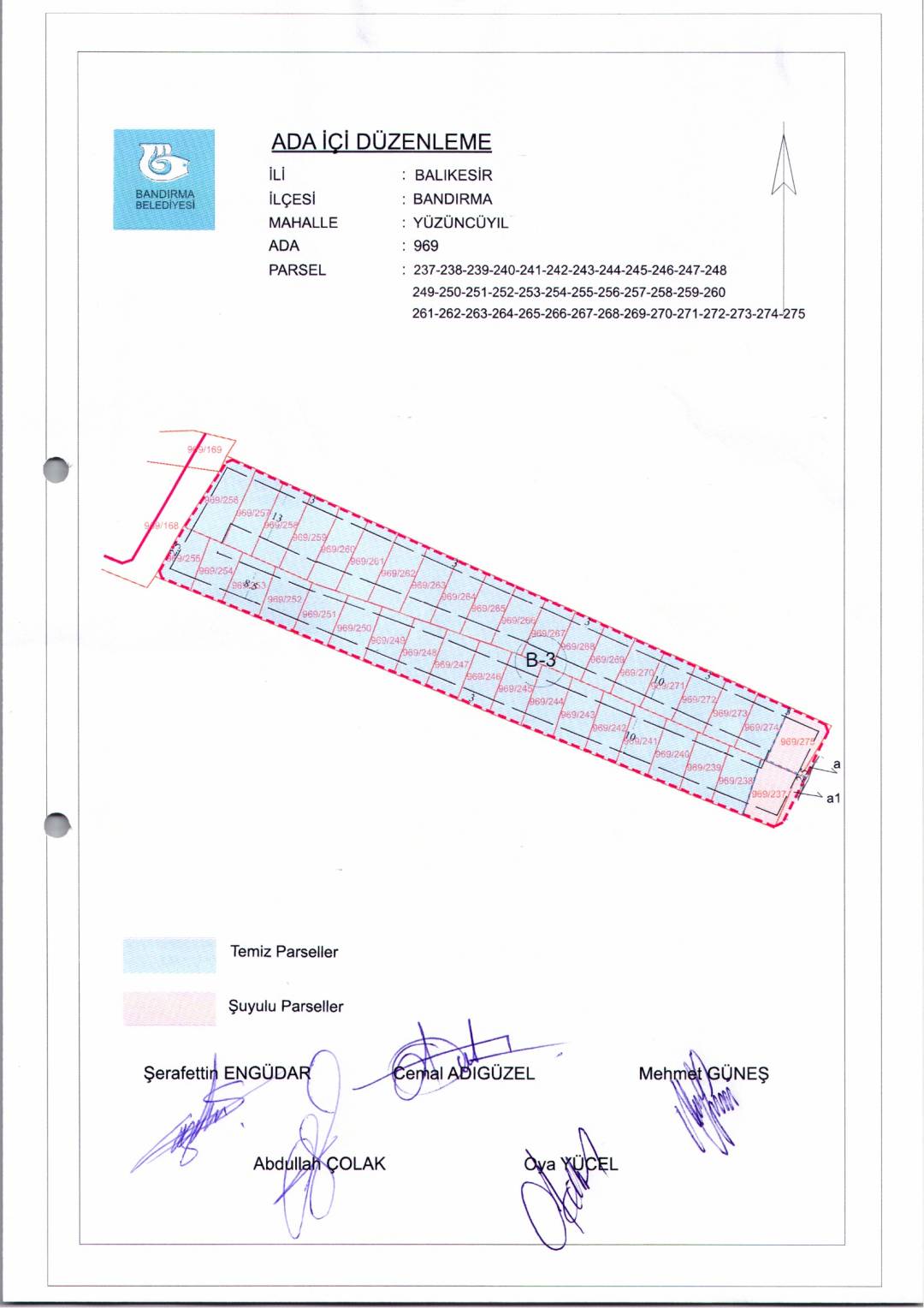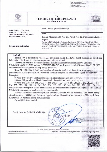 Belediye Encümeninin 21.01.2026 tarih ve 65 sayılı Encümen kararı ile, 100. Yıl Mahallesi, 969 ada, 237-238-239-240-241-242-243-244-245-246-247-248-249-250-251-252-253-254-255-256-257-258-259-260-261-262-263-264-265-266-267-268-269-270-271-272-273-274-275 nolu parsellere ait ada içi düzenlemesinin, 1/1000 ölçekli Bandırma Uygulama İmar Planı notlarının 164. Maddesi ve 3194 sayılı İmar Kanununun 19. maddesi gereği onaylanmasına,
