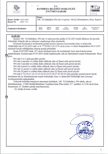 Belediye Encümeninin 08.03.2023 tarih ve 274 sayılı Encümen kararı ile 600 Evler Mahallesi 994 ada 2-3-4-5-6-7-8-9-10-11-12-13-14-21-22-23-24-25-26-27-28-29-30-45 parsellere ait ada içi düzenlemesinin, 1/1000 ölçekli Bandırma Uygulama İmar Planı notlarının 137. Maddesi ve 3194 sayılı İmar Kanununun 19. maddesi gereği onaylanmasına,