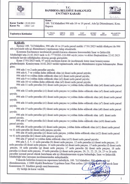 Belediye Encümeninin 22.02.2023 tarih ve 215 sayılı Encümen kararı ile 100.Yıl Mahallesi, 996 adaya ait ada içi düzenlemesinin, 1/1000 ölçekli Bandırma Uygulama İmar Planı notlarının 137. Maddesi ve 3194 sayılı İmar Kanununun 19. maddesi gereği onaylanmasına,