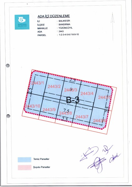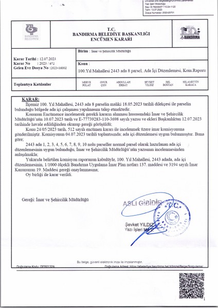 Belediye Encümeninin 12.07.2023 tarih ve 672 sayılı Encümen kararı ile 100. Yıl Mahallesi 2443 ada 1-2-3-4-5-6-7-8-9-10 parsellere ait ada içi düzenlemesinin, 1/1000 ölçekli Bandırma Uygulama İmar Planı notlarının 137. Maddesi ve 3194 sayılı İmar Kanununun 19. maddesi gereği onaylanmasına,