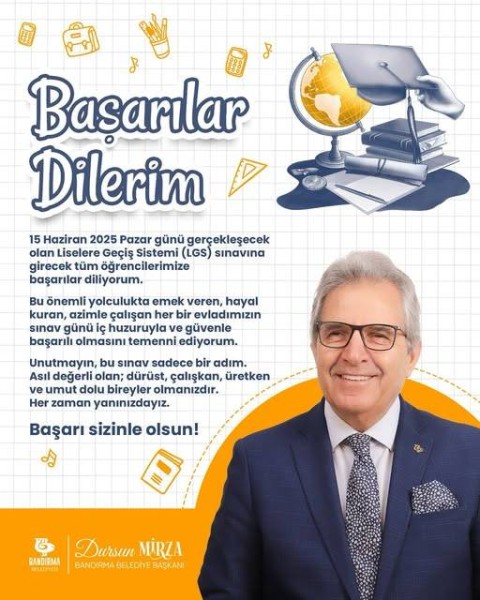 15 Haziran Pazar günü Liselere Geçiş Sistemi (LGS) sınavına girecek tüm öğrencilerimize gönülden başarılar diliyorum. Hayal kuran, emek veren, azimle çalışan her bir evladımızın sınav günü iç huzuruyla ve güvenle başarılı olmasını temenni ediyorum. Bu sınav sadece bir adım. Asıl değerli olan; dürüst, çalışkan, üretken ve umut dolu bireyler olmanızdır. Bandırma Belediyesi olarak her zaman yanınızdayız. Kalbiniz kadar güzel bir gelecek sizleri bekliyor. Başarı sizinle olsun