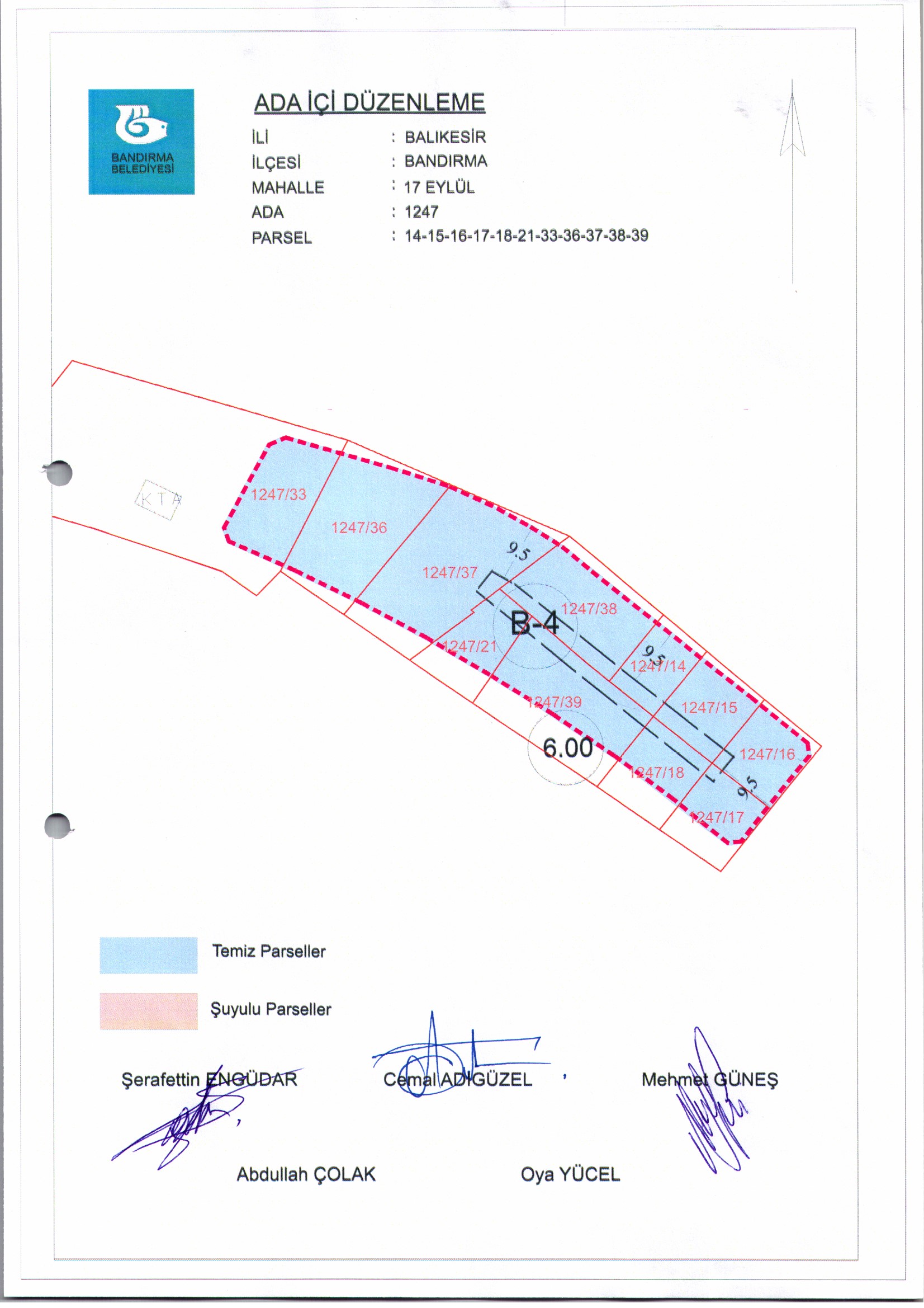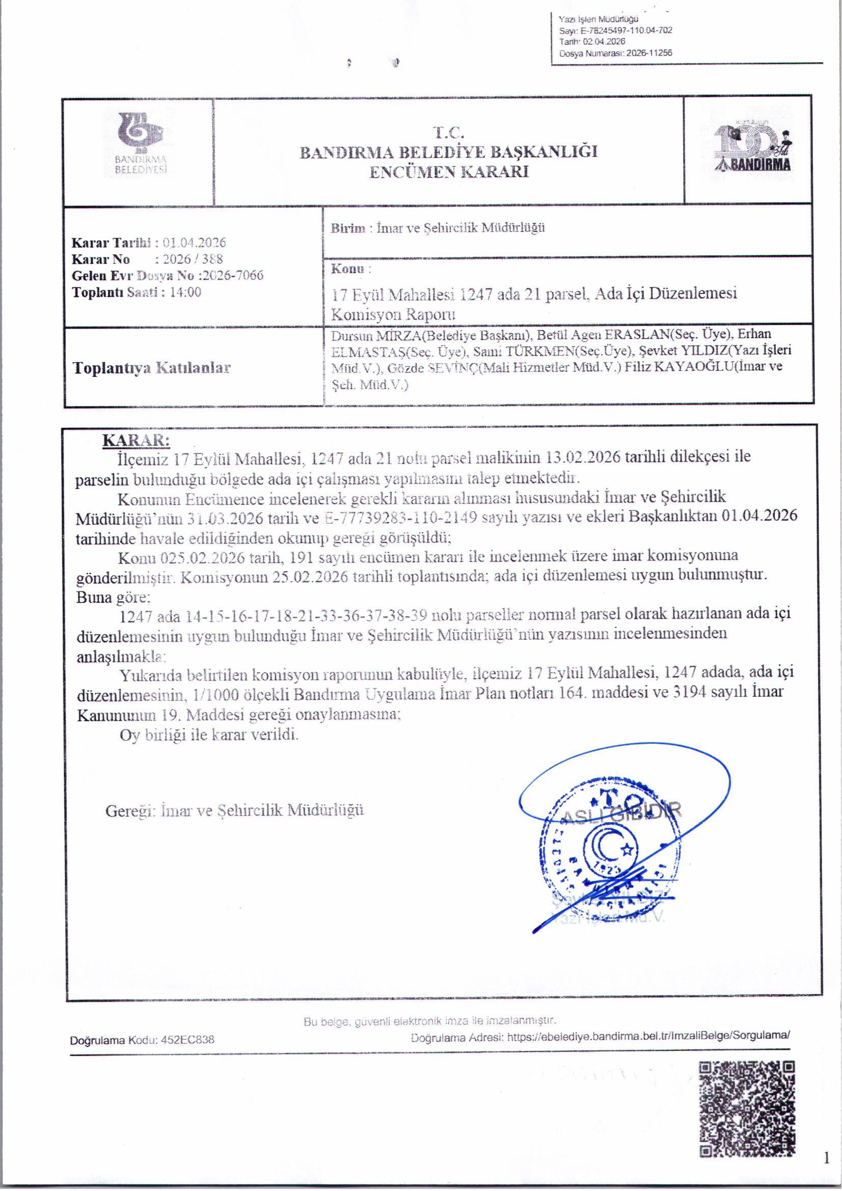 Belediye Encümeninin 01.04.2026 tarih ve 388 sayılı Encümen kararı ile, 17 Eylül Mahallesi, 1247 ada, 14-15-16-17-18-21-33-36-37-38-39 parselleri kapsayan ada içi düzenlemesinin, 1/1000 ölçekli Bandırma Uygulama İmar Planı notlarının 164. Maddesi ve 3194 sayılı İmar Kanununun 19. maddesi gereği onaylanmasına,