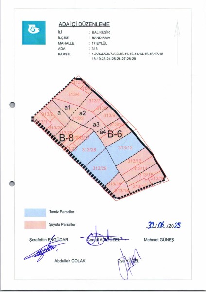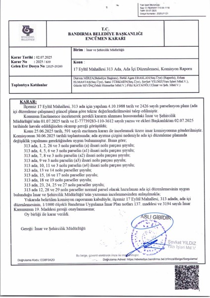 Belediye Encümeninin 02.07.2025 tarih ve 639 sayılı Encümen kararı ile, 17 Eylül Mahallesi, 313 ada 1-2-3-4-5-6-7-8-9-10-11-12-13-14-15-16-17-18-19-23-24-25-26-27-28-29 nolu parsellere ait ada içi düzenlemesinin, 1/1000 ölçekli Bandırma Uygulama İmar Planı notlarının 137. Maddesi ve 3194 sayılı İmar Kanununun 19. maddesi gereği onaylanmasına,