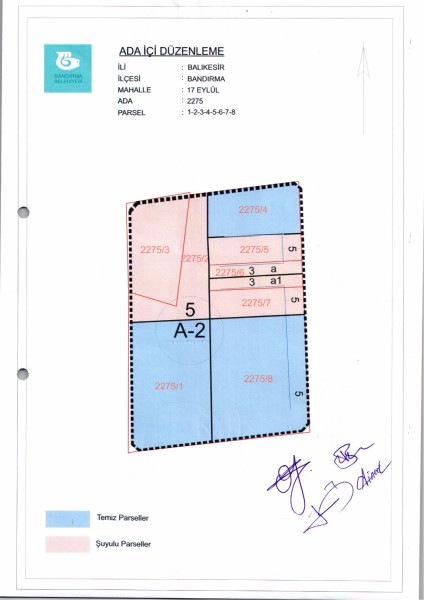 Belediye Encümeninin 12.07.2023 tarih ve 669 sayılı Encümen kararı ile 17 Eylül Mahallesi 2275 ada 1-2-3-4-5-6-7-8 parsellere ait ada içi düzenlemesinin, 1/1000 ölçekli Bandırma Uygulama İmar Planı notlarının 137. Maddesi ve 3194 sayılı İmar Kanununun 19. maddesi gereği onaylanmasına,