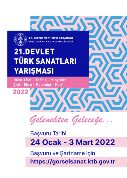 Kültür ve Turizm Bakanlığı tarafından Türk sanatlarını desteklemek, bu alanda eser verecek yeni kabiliyetleri keşfetmek ve bu sanatçıları gelenekten yararlanıp özgün eserler üretmeye teşvik ederek sanatın gelişmesi ve yaygınlaşmasını sağlamak amacıyla, 21. Devlet Türk Sanatları Yarışması düzenlenmiştir. Yarışma aşağıdaki kategorilerde yapılacaktır: “Hüsn-i Hat” “Tezhip” “Minyatür” “Çini” “Ebru” “Kalemişi” “Katı‘” Başvuru ve şartnameler için tıklayın.
