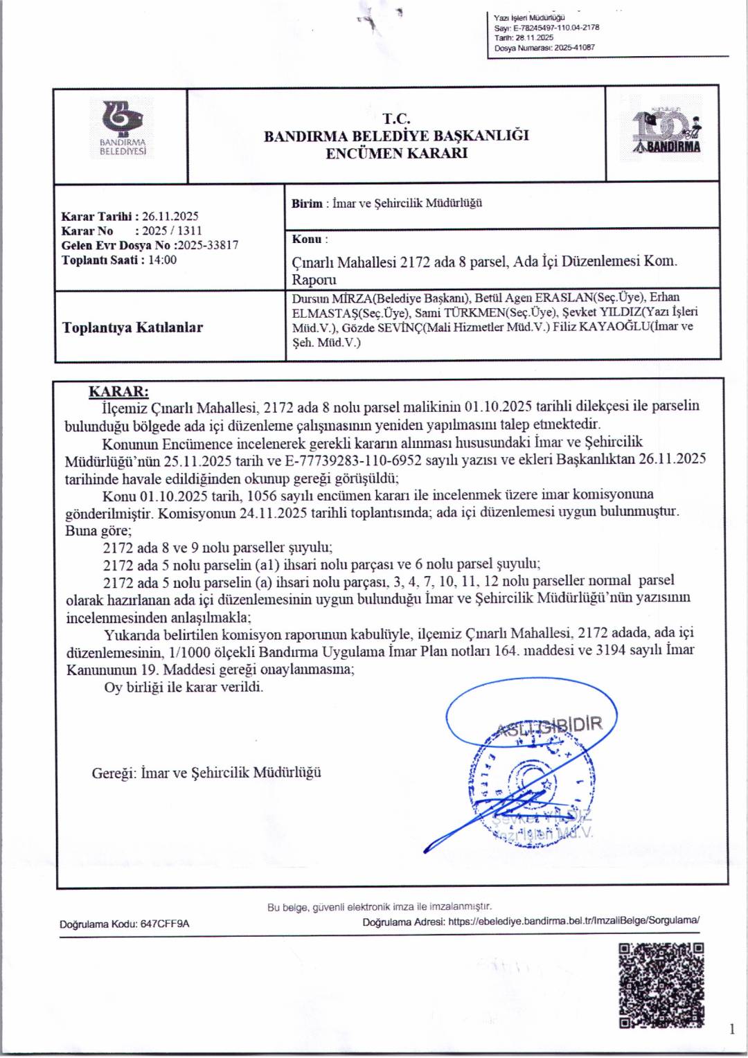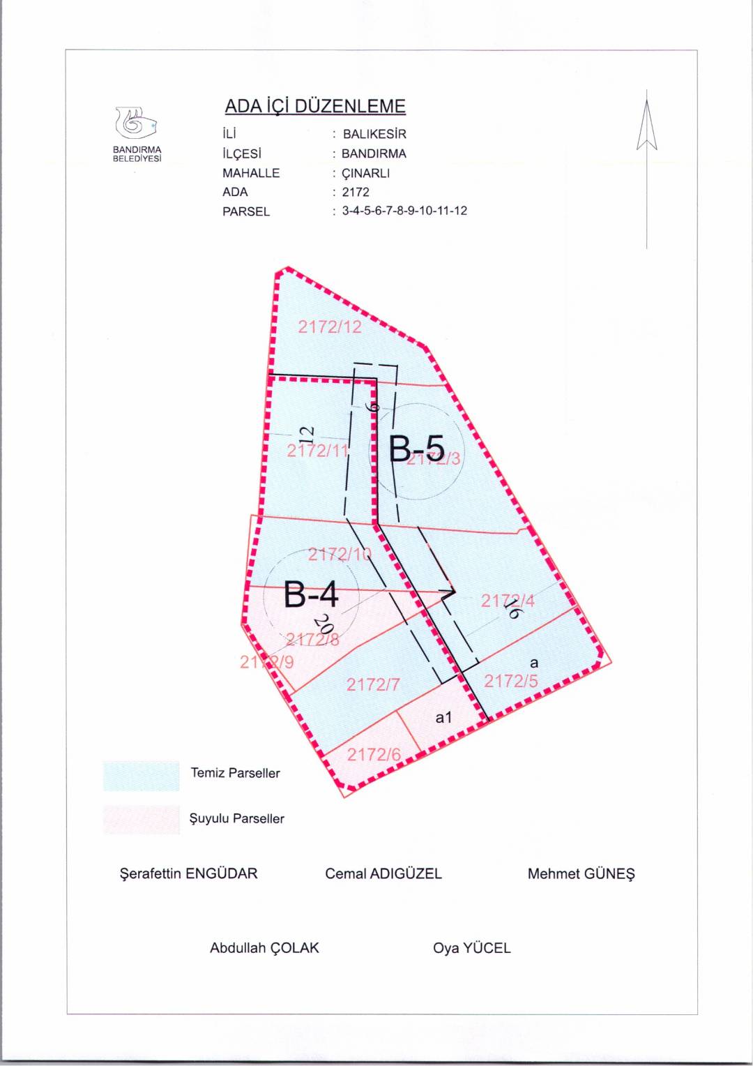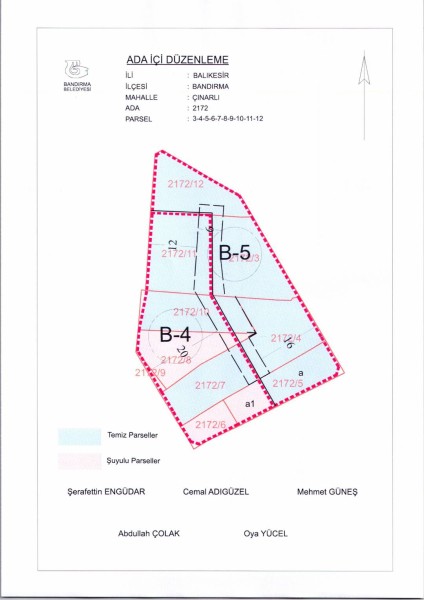 Belediye Encümeninin 26.11.2025 tarih ve 1311 sayılı Encümen kararı ile, Çınarlı Mahallesi, 2172 ada, 3-4-5-6-7-8-9-10-11-12 nolu parsellere ait ada içi düzenlemesinin, 1/1000 ölçekli Bandırma Uygulama İmar Planı notlarının 164. Maddesi ve 3194 sayılı İmar Kanununun 19. maddesi gereği onaylanmasına,