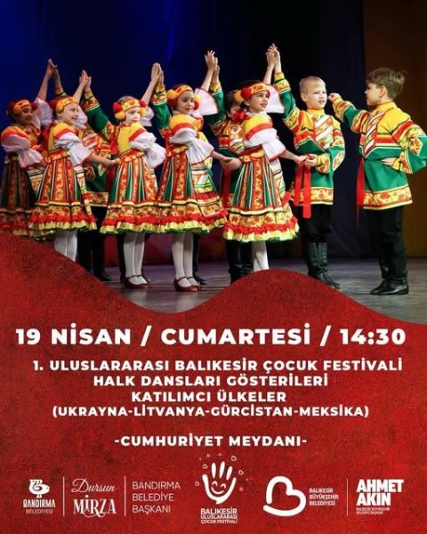Cumhuriyetimizin kurucusu Ulu Önder Gazi Mustafa Kemal Atatürk’ün tüm dünya çocuklarına armağan ettiği 23 Nisan Ulusal Egemenlik ve Çocuk Bayramı’nı dünya çocuklarıyla birlikte kutluyoruz. Balıkesir Büyükşehir Belediyesi tarafından bu yıl 1.’si gerçekleşecek olan Balıkesir Çocuk Festivali Halk Dansları Gösterisi Cumhuriyet Meydanı’nda halkımızla buluşuyor. Farklı ulusların kültür ve danslarını tanıma olanağı sunan festival Bayram’ın tüm renklerini ve coşkusunu bizlere sunacak. Cumhuriyet Meydanı / 19 Nisan Cumartesi / Saat: 14:30