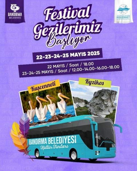 34.Uluslararası Bandırma Kuşcenneti Kültür ve Turizm Festivali Kültür Gezileri Başlıyor! Festivalimize ilham olan doğa harikası, geçmişin geleceğe mirası, Avrupa Konseyi A Diplomasına sahip Kuşcenneti Milli Parkı ile doğanın kalbinde büyülü bir medeniyet olan Kyzikos Antik Kenti’nin güzelliklerini hep birlikte keşfediyoruz. Doğanın ve tarihin güzelliklerinde buluşalım. Gezi Tarihleri ve Saatleri: 22 Mayıs 2025 – Saat:18.00 23-24-25 Mayıs 2025 – Saat: 12.00/14.00/16.00/18.00 Başvurularınızı 444 7 105 numaralı çağrı merkezini arayarak ya da Halk Masası üzerinden şahsen gerçekleştirebilirsiniz.