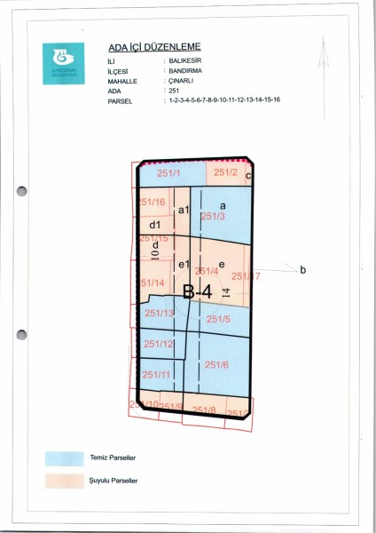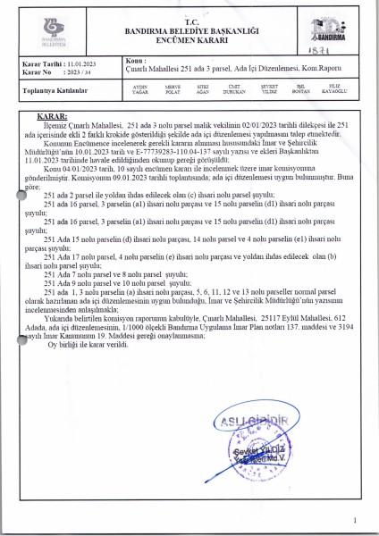 Belediye Encümeninin 11.01.2023 tarih ve 34 sayılı Encümen kararı ile Çınarlı Mahallesi 251 ada 1-2-3-4-5-6-7-8-9-10-11-12-13-14-15-16 parsellere ait ada içi düzenlemesinin, 1/1000 ölçekli Bandırma Uygulama İmar Planı notlarının 137. Maddesi ve 3194 sayılı İmar Kanununun 19. maddesi gereği onaylanmasına,