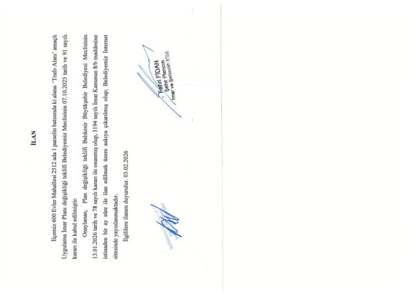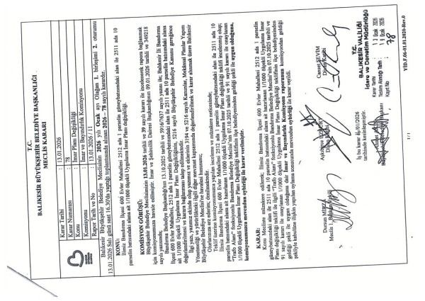 Onaylanan, Plan değişikliği teklifi Balıkesir Büyükşehir Belediyesi Meclisinin 13.01.2026 tarih ve 78 sayılı kararı ile onanmış olup, 3194 sayılı İmar Kanunun 8/b maddesine istinaden bir ay süre ile ilan edilmek üzere askıya çıkarılmış olup; Belediyemiz İnternet sitesinde yayınlanmaktadır.