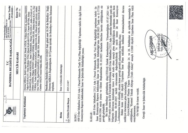 İlçemiz 600 Evler Mahallesi 2512 ada 1 parselin batısında ki alana ‘Trafo Alanı’ amaçlı Uygulama İmar Planı değişikliği teklifi Belediyemiz Meclisinin 07.10.2025 tarih ve 91 sayılı kararı ile kabul edilmiştir.