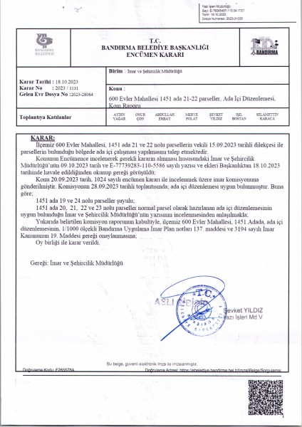 Belediye Encümeninin 18.10.2023 tarih ve 1131 sayılı Encümen kararı ile Yenimahalle, 1451 ada 19-20-21-22-23-24 parsellere ait ada içi düzenlemesinin, 1/1000 ölçekli Bandırma Uygulama İmar Planı notlarının 137. Maddesi ve 3194 sayılı İmar Kanununun 19. maddesi gereği onaylanmasına,