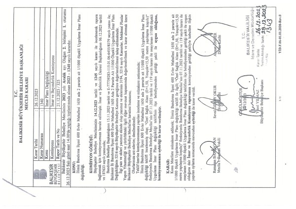 Onaylanan, Plan değişikliği teklifi Balıkesir Büyükşehir Belediyesi Meclisinin 26.12.2023 tarih ve 1340 sayılı kararı ile onanmış olup, 3194 sayılı İmar Kanunun 8/b maddesine istinaden bir ay süre ile ilan edilmek üzere askıya çıkarılmış olup; Belediyemiz İnternet sitesinde yayınlanmaktadır.