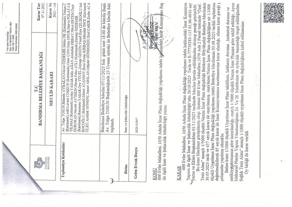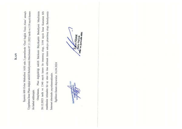 İlçemiz 600 Evler Mahallesi 1650 ada 2 parsellerde ‘Özel Sağlık Tesis Alanı’ amaçlı Uygulama İmar Planı değişi teklifi Belediyemiz Meclisinin 07.11.2023 tarih ve 119 sayılı kararı ile kabul edilmiştir.