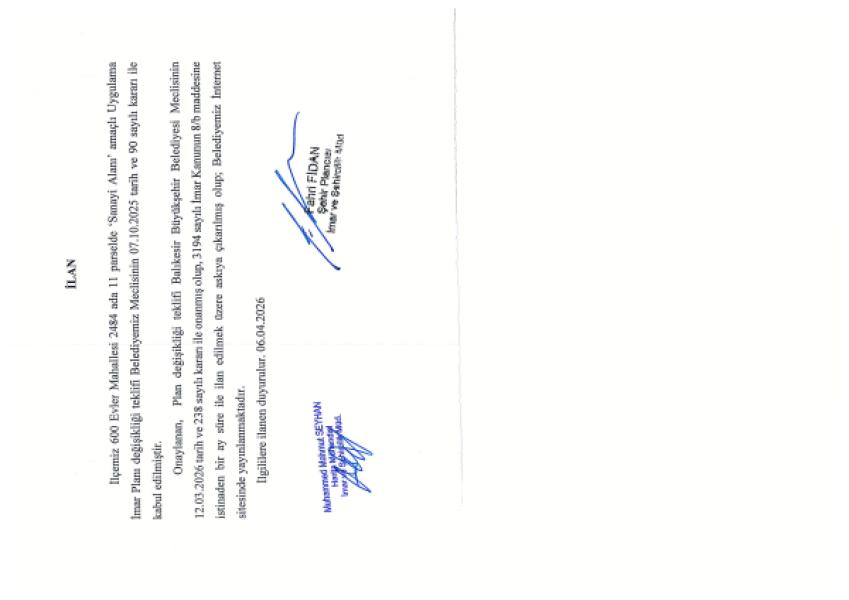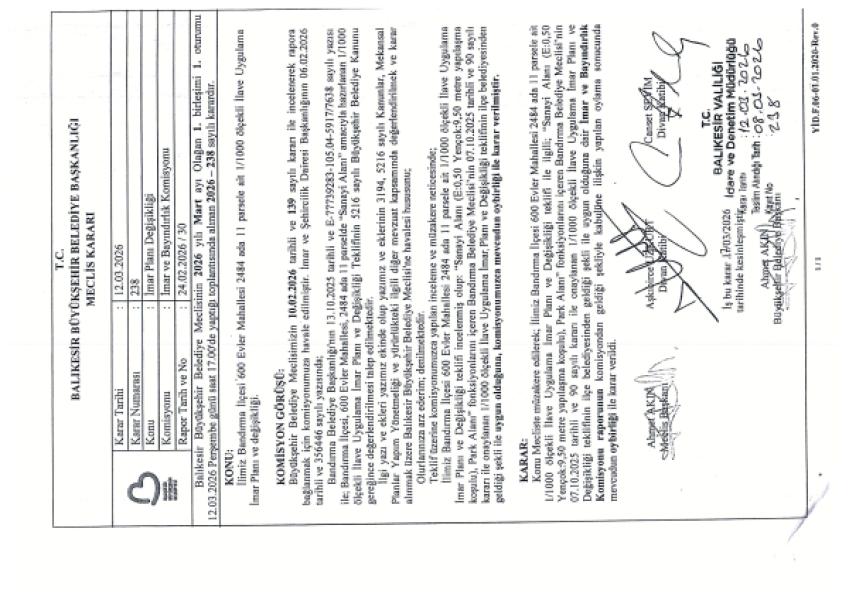 Onaylanan, Plan değişikliği teklifi Balıkesir Büyükşehir Belediyesi Meclisinin 12.03.2026tarih ve 238 sayılı kararı ile onanmış olup, 3194 sayılı İmar Kanunun 8/b maddesine istinaden bir ay süre ile ilan edilmek üzere askıya çıkarılmış olup; Belediyemiz İnternet sitesinde yayınlanmaktadır.
