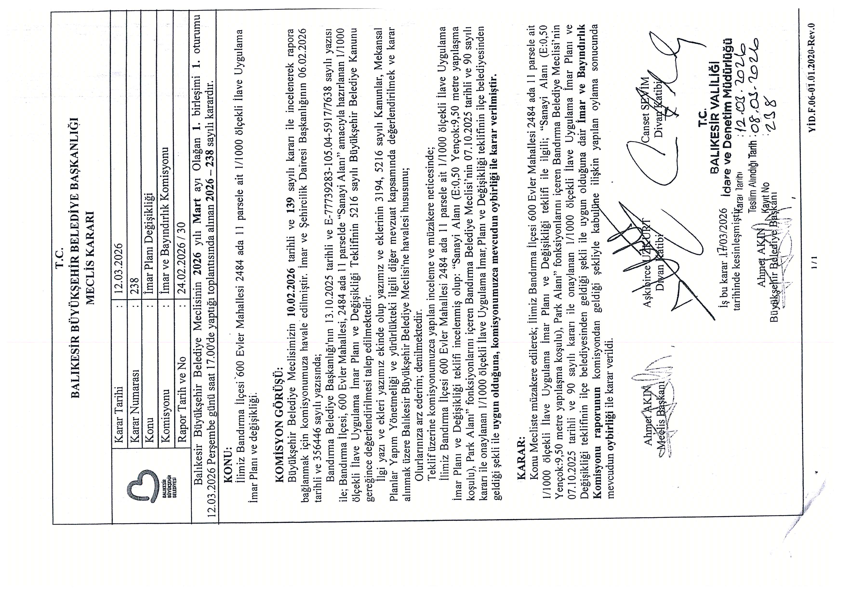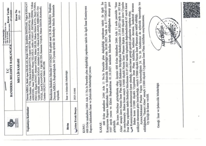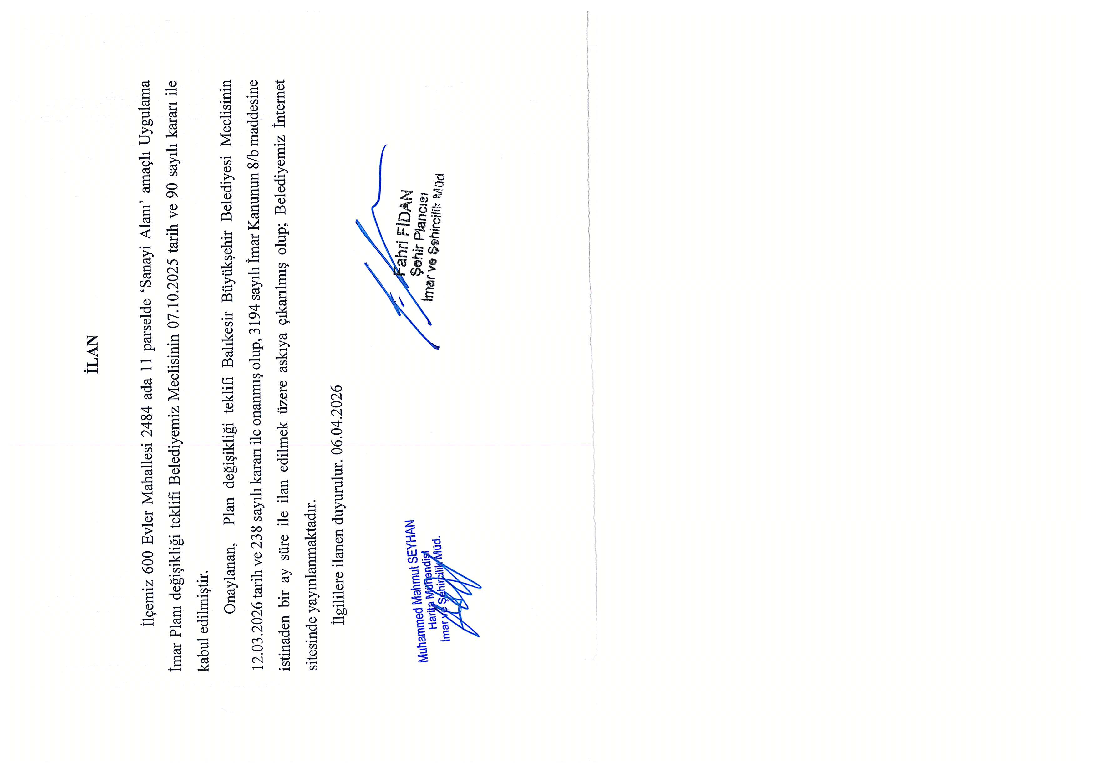İlçemiz 600 Evler Mahallesi 2484 ada 11 parselde ‘Sanayi Alanı’ amaçlı Uygulama İmar Planı değişikliği teklifi Belediyemiz Meclisinin 07.10.2025 tarih ve 90 sayılı kararı ile kabul edilmiştir.