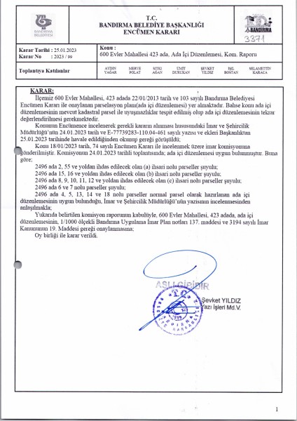 Belediye Encümeninin 25.01.2023 tarih ve 99 sayılı Encümen kararı ile 600 Evler Mahallesi 2496 ada 2-3-4-5-6-7-8-9-10-11-12-13-14-15-16-18-55 parsellere ait ada içi düzenlemesinin, 1/1000 ölçekli Bandırma Uygulama İmar Planı notlarının 137. Maddesi ve 3194 sayılı İmar Kanununun 19. maddesi gereği onaylanmasına,