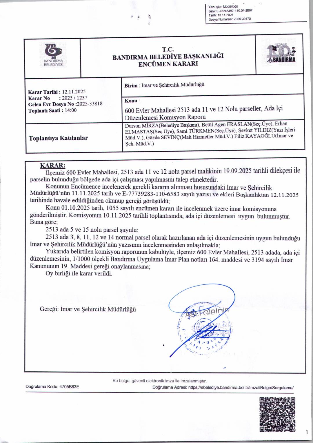 Belediye Encümeninin 12.11.2025 tarih ve 1237 sayılı Encümen kararı ile, 600 Evler Mahallesi, 2513 ada, 1-2-3-4-5-6-8-9 nolu parsellere ait ada içi düzenlemesinin, 1/1000 ölçekli Bandırma Uygulama İmar Planı notlarının 137. Maddesi ve 3194 sayılı İmar Kanununun 19. maddesi gereği onaylanmasına,