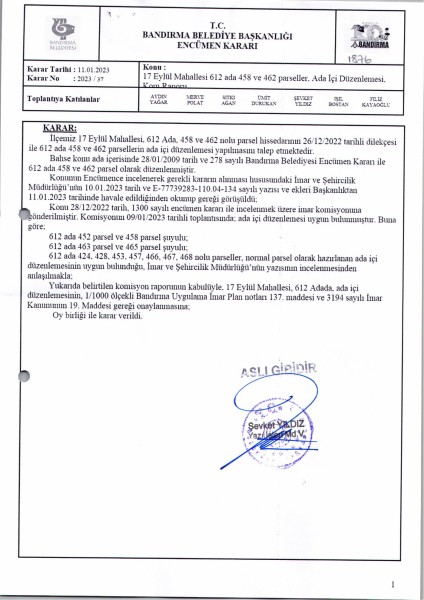 Belediye Encümeninin 11.01.2023 tarih ve 37 sayılı Encümen kararı ile 600 Evler Mahallesi 612 ada 424-428-453-457-458-462-463-465-466parsellere ait ada içi düzenlemesinin, 1/1000 ölçekli Bandırma Uygulama İmar Planı notlarının 137. Maddesi ve 3194 sayılı İmar Kanununun 19. maddesi gereği onaylanmasına,