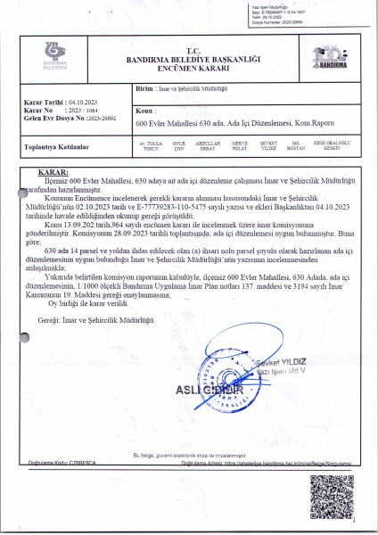 Belediye Encümeninin 04.10.2023 tarih ve 1064 sayılı Encümen kararı ile 600 Evler Mahallesi, 630 ada 14 parsele ait ada içi düzenlemesinin, 1/1000 ölçekli Bandırma Uygulama İmar Planı notlarının 137. Maddesi ve 3194 sayılı İmar Kanununun 19. maddesi gereği onaylanmasına,