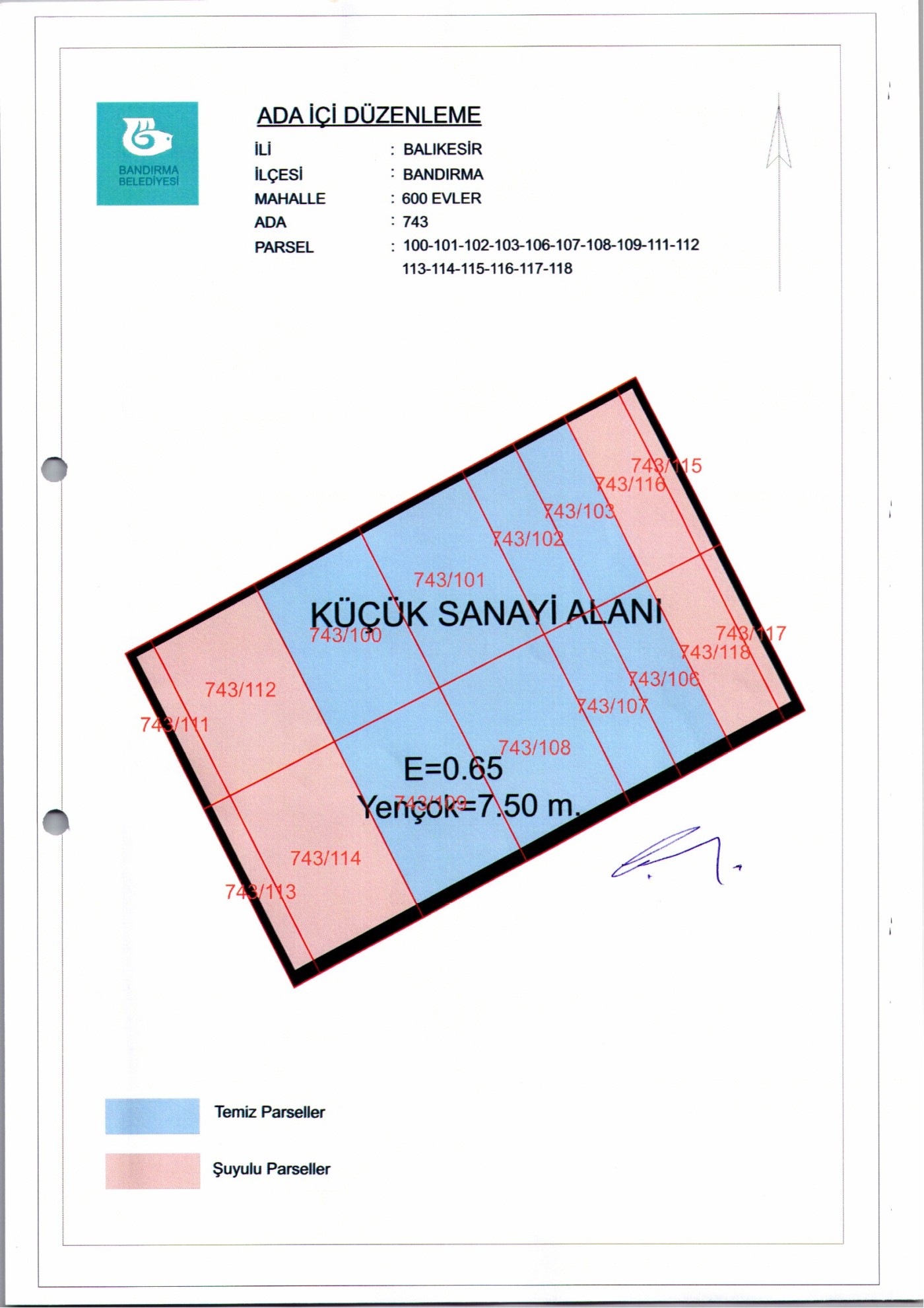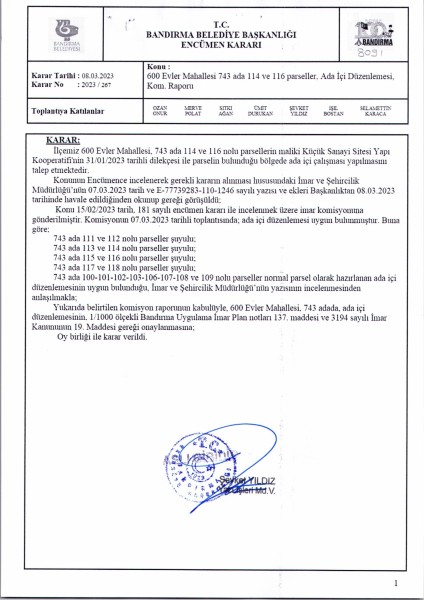 Belediye Encümeninin 08.03.2023 tarih ve 267 sayılı Encümen kararı ile 600 Evler Mahallesi 743 ada 100-101-102-103-106-017-108-109-111-112-113-114-115-116117-118 ait ada içi düzenlemesinin, 1/1000 ölçekli Bandırma Uygulama İmar Planı notlarının 137. Maddesi ve 3194 sayılı İmar Kanununun 19. maddesi gereği onaylanmasına,