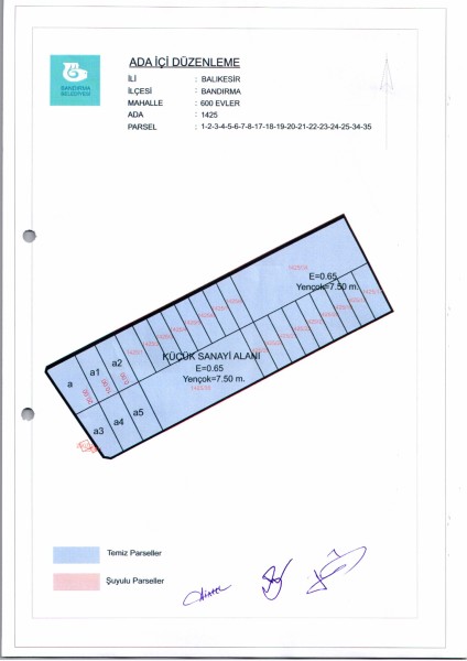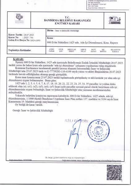 Belediye Encümeninin 26.07.2023 tarih ve 750 sayılı Encümen kararı ile 600 Evler Mahallesi 1425 ada 1-2-3-4-5-6-7-8-17-18-19-20-21-22-23-24-25-34-35 parsellere ait ada içi düzenlemesinin, 1/1000 ölçekli Bandırma Uygulama İmar Planı notlarının 137. Maddesi ve 3194 sayılı İmar Kanununun 19. maddesi gereği onaylanmasına,