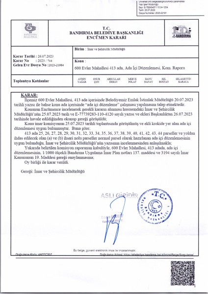 Belediye Encümeninin 26.07.2023 tarih ve 744 sayılı Encümen kararı ile 600 Evler Mahallesi 413 ada 25-26-27-28-29-30-31-32-33-34-35-36-37-38-39-40-41-42-43-44 parsellere ait ada içi düzenlemesinin, 1/1000 ölçekli Bandırma Uygulama İmar Planı notlarının 137. Maddesi ve 3194 sayılı İmar Kanununun 19. maddesi gereği onaylanmasına,
