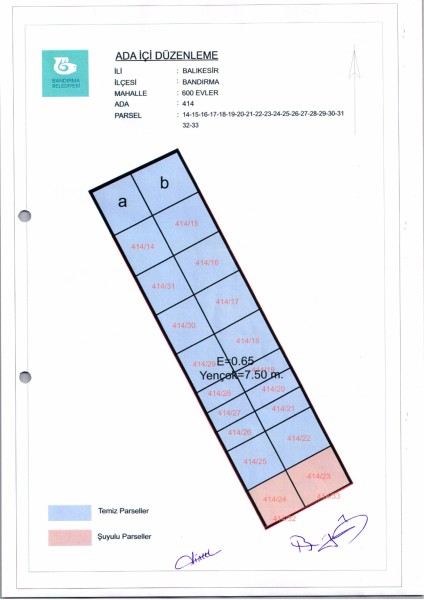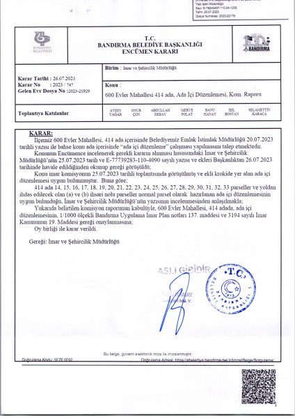 Belediye Encümeninin 26.07.2023 tarih ve 747 sayılı Encümen kararı ile 600 Evler Mahallesi 414 ada 14-15-16-17-18-19-20-21-22-23-24-25-26-27-28-29-30-31-32-33 parsellere ait ada içi düzenlemesinin, 1/1000 ölçekli Bandırma Uygulama İmar Planı notlarının 137. Maddesi ve 3194 sayılı İmar Kanununun 19. maddesi gereği onaylanmasına,
