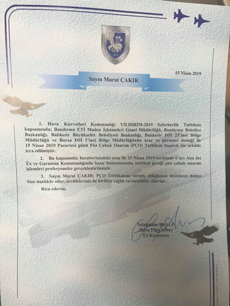 Bandırma 6. Ana Jet Üs Komutanı Hv.Plt.Alb. Selahattin Akalp, 15 Nisan 2019 tarihinde gerçekleşen Pist Onarım Tatbikatına verilen araç ve personel desteği için Başkanımız Tolga Tosun'a teşekkür ziyaretinde bulunurken, tatbikata katılan personellerimiz'e teşekkür sertifikası takdim etti.Kentimizin gelişmesi,güzelleşmesi için tüm kurum ve kuruluşlarla diyalog ve işbirliği içerisinde çalışıyoruz.