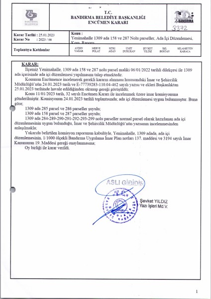 Belediye Encümeninin 25.01.2023 tarih ve 98 sayılı Encümen kararı ile Yenimahalle 1309 ada 158-284-285-286-287-289-290-291-292-293-299 parsellere ait ada içi düzenlemesinin, 1/1000 ölçekli Bandırma Uygulama İmar Planı notlarının 137. Maddesi ve 3194 sayılı İmar Kanununun 19. maddesi gereği onaylanmasına,