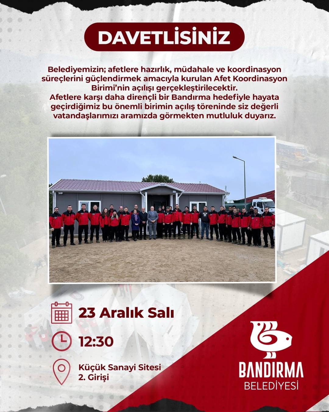 Afetlere karşı daha dirençli bir Bandırma hedefiyle hayata geçirdiğimiz bu önemli günde, tüm hemşehrilerimizi aramızda görmekten mutluluk duyarız.