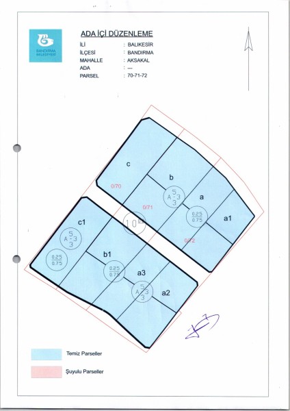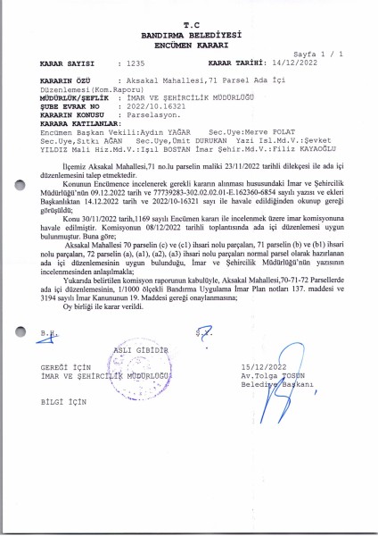 Belediye Encümeninin 14/12/2022 tarih ve 1235 sayılı Encümen kararı ile Aksakal Mahallesi, 70-71-72 parsellere ait ada içi düzenlemesinin, 1/1000 ölçekli Bandırma Uygulama İmar Planı notlarının 137. Maddesi ve 3194 sayılı İmar Kanununun 19. maddesi gereği onaylanmasına,
