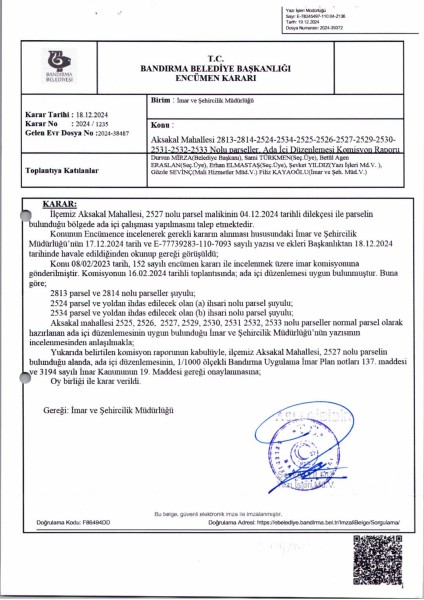 Belediye Encümeninin 18.12.2024 tarih ve 1235 sayılı Encümen kararı ile Aksakal Mahallesi, 2524, 2525, 2526, 2527, 2529, 2530, 2531, 2532, 2533, 2534, 2813, 2814 nolu parsellere ait ada içi düzenlemesinin, 1/1000 ölçekli Bandırma Uygulama İmar Planı notlarının 137. Maddesi ve 3194 sayılı İmar Kanununun 19. maddesi gereği onaylanmasına,