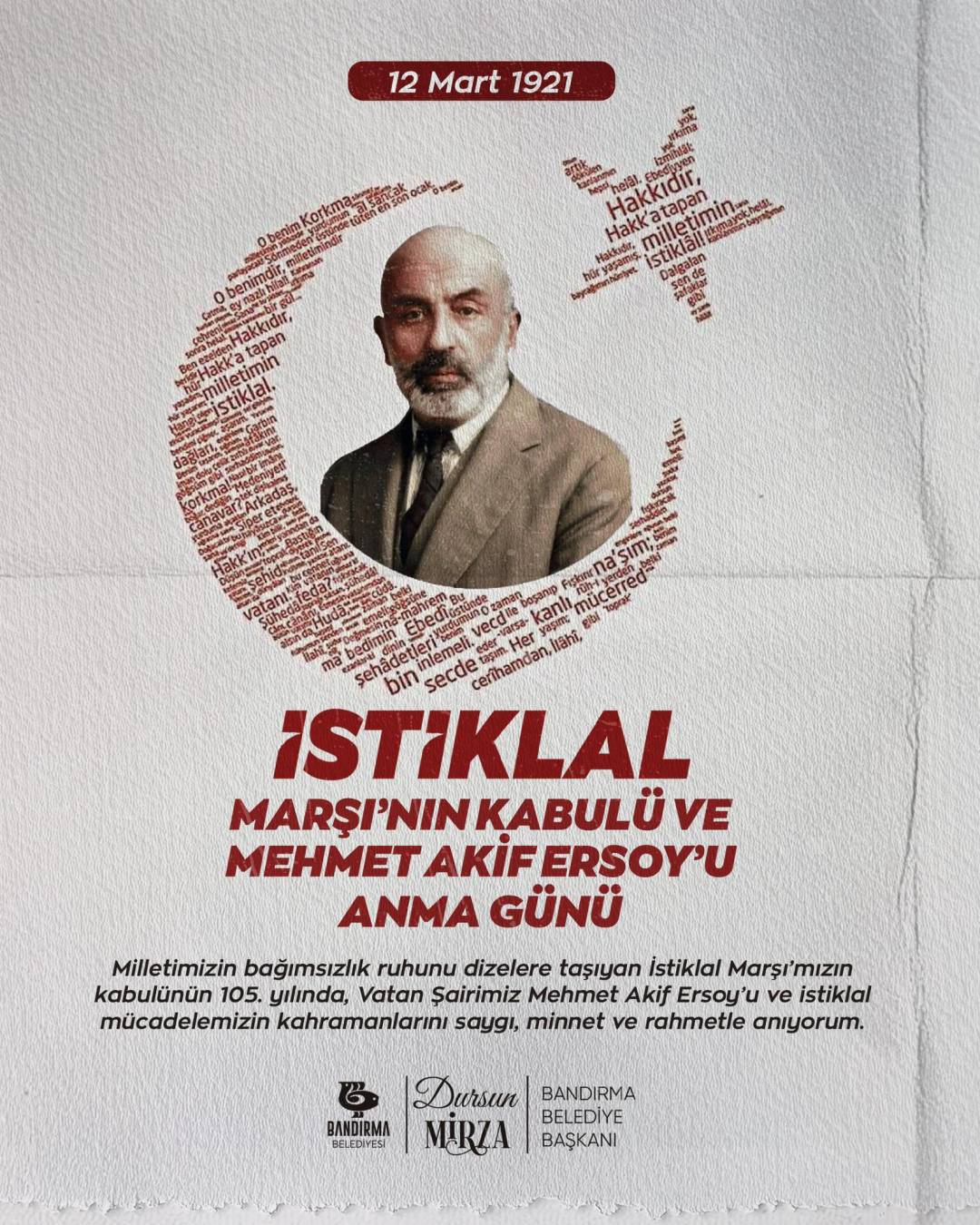 Bugün, 12 Mart 1921’de kabul edilen ve 105 yıldır dilimizden, yüreğimizden düşmeyen İstiklal Marşımızı ve onu bizlere kazandırarak Türk gençliğine ufuk çizen Milli Şairimiz Mehmet Akif Ersoy’u anıyoruz.