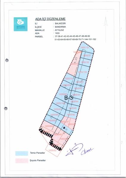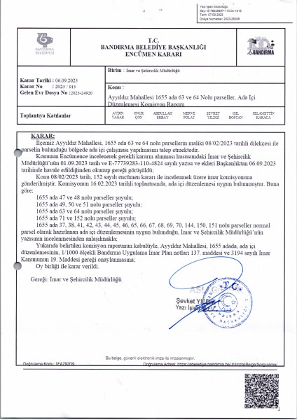 Belediye Encümeninin 06.09.2023 tarih ve 913 sayılı Encümen kararı ile Ayyıldız Mahallesi, 1655 ada 37-38-41-42-43-44-45-46-47-48-49-50-51-63-64-65-66-67-68-69-70-71-144-151-152 parsele ait ada içi düzenlemesinin, 1/1000 ölçekli Bandırma Uygulama İmar Planı notlarının 137. Maddesi ve 3194 sayılı İmar Kanununun 19. maddesi gereği onaylanmasına,