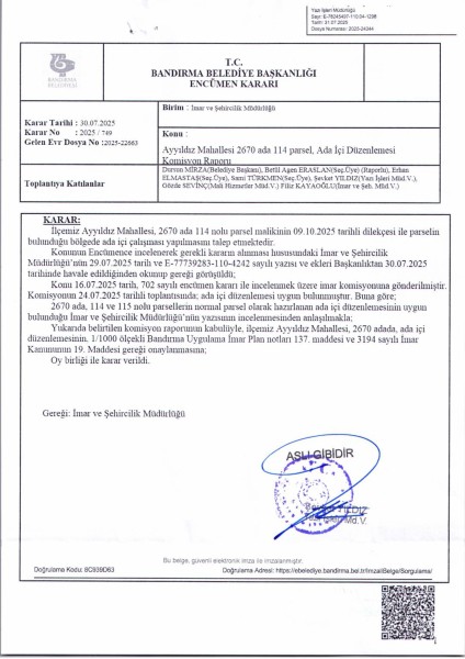Belediye Encümeninin 30.07.2025 tarih ve 749 sayılı Encümen kararı ile, Ayyıldız Mahallesi, 2670 ada 114 ve 115 nolu parsellere ait ada içi düzenlemesinin, 1/1000 ölçekli Bandırma Uygulama İmar Plan notlarının 137. Maddesi ve 3194 sayılı İmar Kanununun 19. maddesi gereği onaylanmasına,