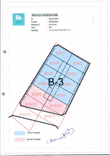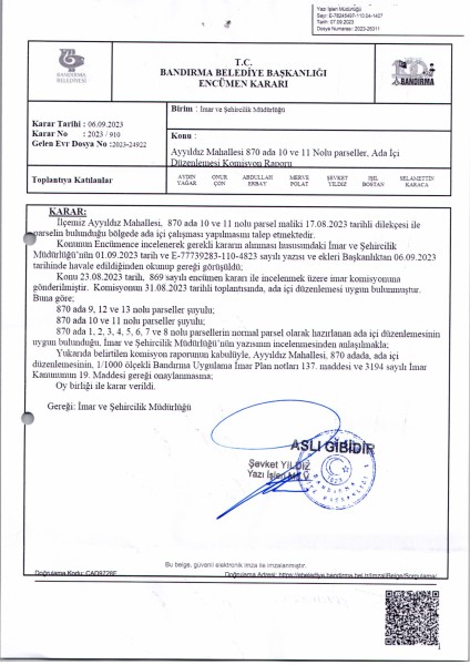 Belediye Encümeninin 06.09.2023 tarih ve 910 sayılı Encümen kararı ile Ayyıldız Mahallesi 870 ada 1-2-3-4-5-6-7-8-9-10-11-12-13 parsellere ait ada içi düzenlemesinin, 1/1000 ölçekli Bandırma Uygulama İmar Planı notlarının 137. Maddesi ve 3194 sayılı İmar Kanununun 19. maddesi gereği onaylanmasına,