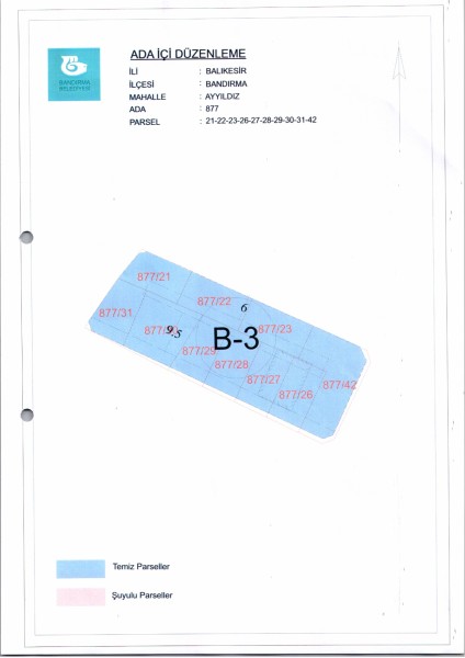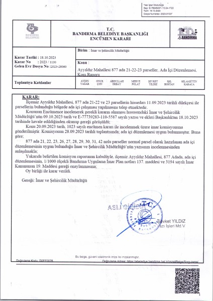 Belediye Encümeninin 18.10.2023 tarih ve 1130 sayılı Encümen kararı ile Ayyıldız Mahallesi, 877 ada 21-22-23-26-27-28-29-30-31-42 parsellere ait ada içi düzenlemesinin, 1/1000 ölçekli Bandırma Uygulama İmar Planı notlarının 137. Maddesi ve 3194 sayılı İmar Kanununun 19. maddesi gereği onaylanmasına,