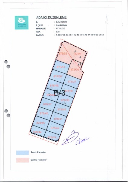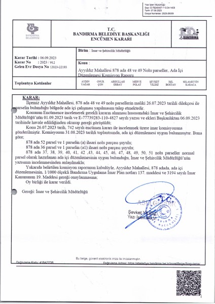 Belediye Encümeninin 06.09.2023 tarih ve 912 sayılı Encümen kararı ile Ayyıldız Mahallesi, 878 ada 1-36-37-38-39-40-41-42-43-44-45-46-47-48-49-50-51-52 parsele ait ada içi düzenlemesinin, 1/1000 ölçekli Bandırma Uygulama İmar Planı notlarının 137. Maddesi ve 3194 sayılı İmar Kanununun 19. maddesi gereği onaylanmasına,