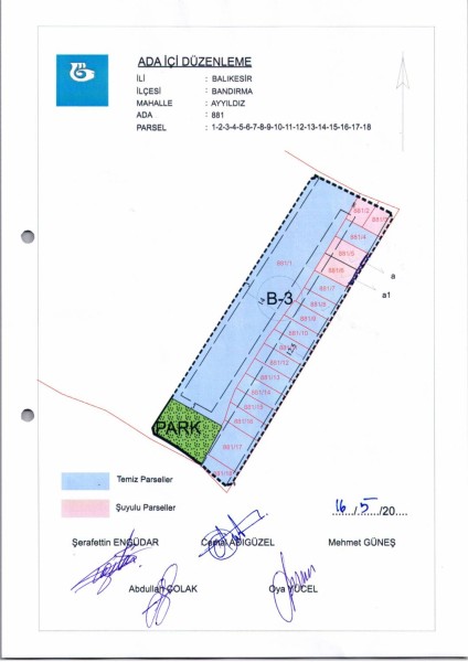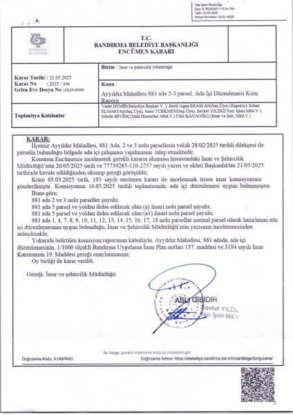 Belediye Encümeninin 21.05.2025 tarih ve 456 sayılı Encümen kararı ile, Ayyıldız Mahallesi 881 ada 1-2-3-4-5-6-7-8-910-11-12-13-14-15-16-17-18 nolu parsellere ait ada içi düzenlemesinin, 1/1000 ölçekli Bandırma Uygulama İmar Planı notlarının 137. Maddesi ve 3194 sayılı İmar Kanununun 19. maddesi gereği onaylanmasına,
